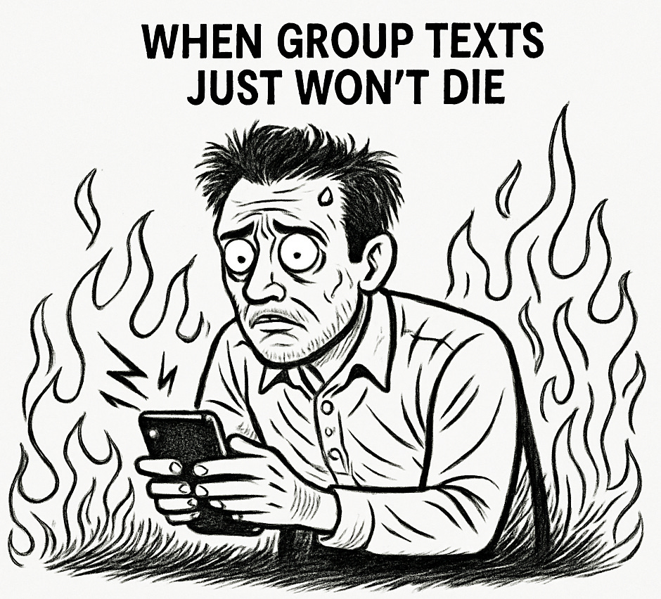 Group texts can be funny, helpful, even sweet. However, there should be a law - federal, if possible, that they expire within 90 minutes. After that, they’re a group hug that turned into a chokehold.