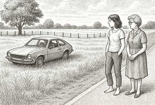 There they were. Two middle-aged women (one with bare feet. I’ll let you guess which one.) standing on the side of a two-lane country road, looking over at the Pinto like it had just fallen from the sky—and they had no earthly idea how.