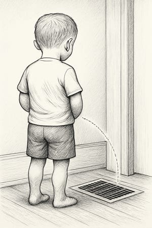But wouldn’t you know it—summer turned to winter, my folks cranked up the furnace, and the whole house smelled like my “summer project.” Imagine Thanksgiving dinner with a side of Eau de Toddler Piss. My parents were not amused. Hence the title—Urine trouble. And you better believe I was.